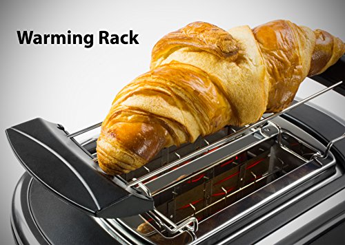 Der mattschwarze Toaster besitzt einen praktischen Brötchenaufsatz, der außerdem ideal zum Toasten von Croissants, Milchbrötchen und süßen Teilchen ist. Der 2-Scheiben Toaster kann selbst dicke Scheiben fassen und ist außerdem mit einer Auftau- und Aufwärmfunktion, einer Stopp-Taste, sowie einer Bräunungsgrad-Kontrollleiste ausgestattet. So genießen Sie jeden Morgen perfekten Toast.