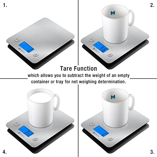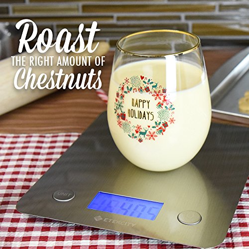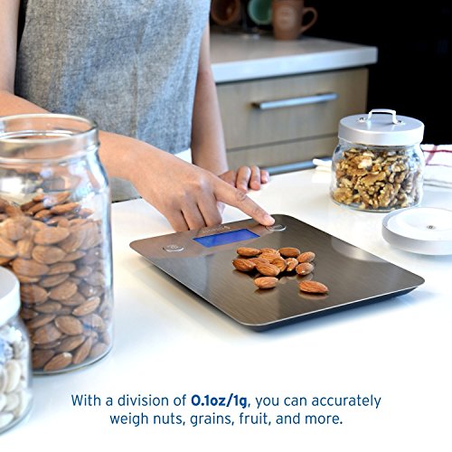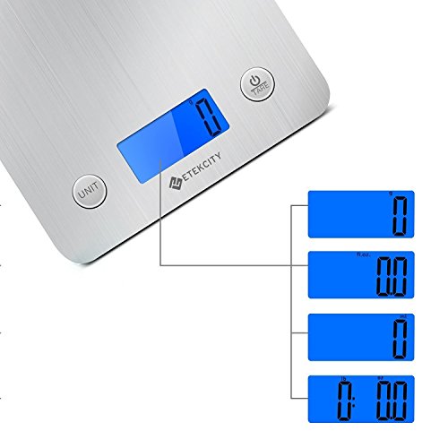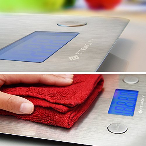Eine gute Küchenwaage ist in einem guten Haushalt unumgänglich. Diese Etekcity digitale Küchenwaage ist aus Edelstahl. Das Material bietet eine gehobene, anspruchsvolle Ästhetik, die eine große Auswahl an Küchendesigns ergänzt. Und zwar sie verfügt über eine beleuchtete LCD-Anzeige, die sich deutlich von ihrer Umgebung abhebt, und besonders große Ziffern, die das Ablesen bei allen Lichtbedingungen vereinfachen. Das schmale und leichte Design ermöglicht eine platzsparende Aufbewahrung; ideal auch bei kleineren Küchen.