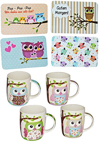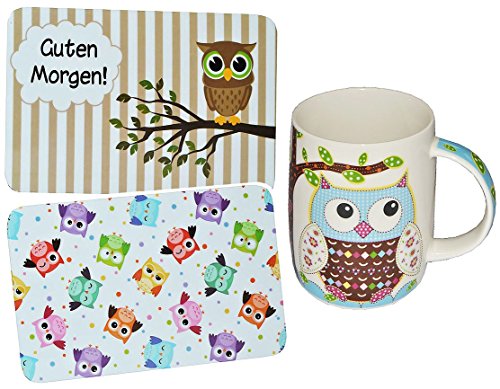 hochwertiges anti – rutsch – Frühstücksbrett + Henkeltasse / Schneidebrett mit verschiedenen Eulen Motiven