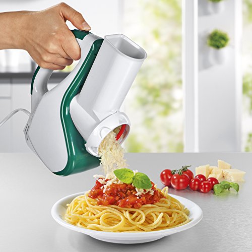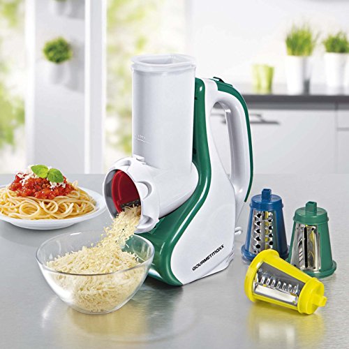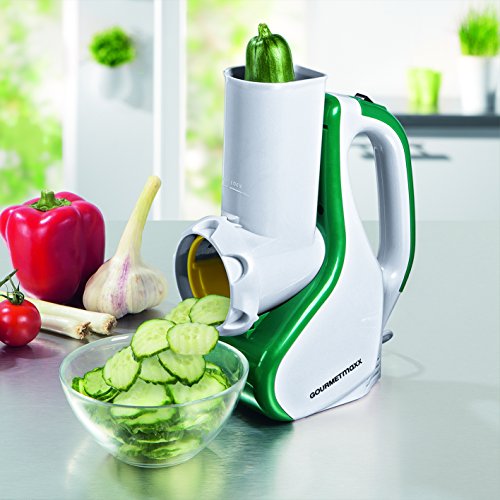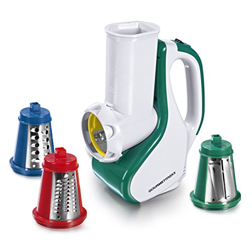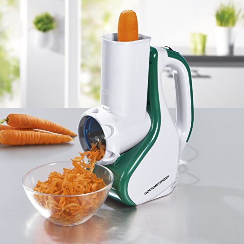 Haben Sie Appetit auf eine leckere Gemüsepfanne oder einen knackigen Rohkostsalat? Mit dem „GOURMETmaxx“ Chefschneider bereiten Sie beides und noch viel mehr im Handumdrehen zu. Einfach den entsprechenden Trommeleinsatz einsetzen, den großen Knopf drücken und los! Der „GOURMETmaxx“ Chefschneider reibt, raspelt und schneidet Kartoffeln, Zwiebeln und sonstiges Gemüse sowie Obst in kürzester Zeit – direkt auf den Teller oder in den Topf! Die Trommeleinsätze lassen sich anschließend im Geschirrspüler reinigen. Durch seine kompakte Größe findet er ganz leicht Platz in jeder Küche. Mit 4 austauschbaren Klingenpaaren. 150 Watt. Kabellänge: 65 cm. Maße (L x B x H): ca. 22 x 11 x 29 cm.