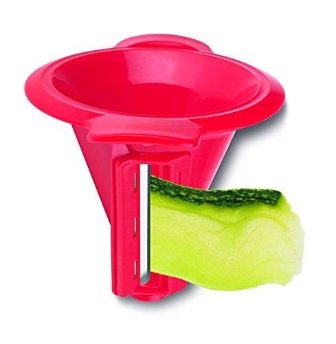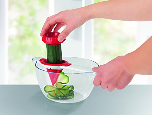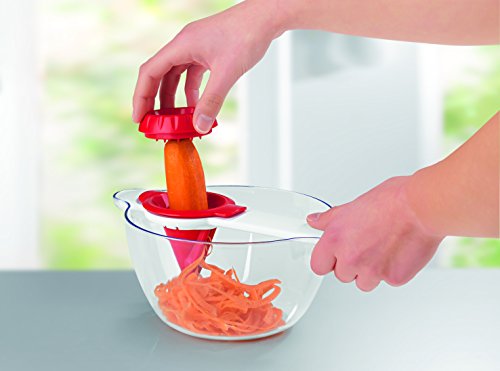 in die Schnitt-Öffnung einführen, drehen und schon ringeln sich wahlweise feine Spiralen oder breite Streifen direkt in die praktische Auffangschüssel — ideal zum Aufbewahren oder Servieren. So zaubern Sie blitzschnell leckere Gemüse-Nudeln