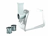 Schneidet, raspelt und reibt Gemüse, Früchte, Käse, Nüsse und vieles mehr. Vielfältig und praktisch mit acht verschiedenen Anwendungen durch drei doppelseitige und zwei einseitige Scheiben. Mit langlebigem, dauerlauffestem Permanentmagnetmotor mit gleichbleibender Drehzahl selbst unter Belastung und zwei Geschwindigkeitsstufen.