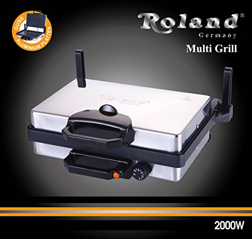 2000 Watt Elektro- Multigrill von Roland Bereiten sie: Frikadellen, Schaschlik, Kebab Brot & Fladenbrot, Pizza, Falafel, Crepes, Waffeln.. zu wie die Profis! Produkteigenschaften: -Ein- und Ausschalter mit 5-Stufen Temperaturregler -Kontrollleuchte -Doppelte Antihaftbeschichtung -Glatte Ober & Unterplatte -Brat- und Backplatten 340 x 220 mm -2000 Watt Leistung 230 V Ohne Kasser Rolle 3 Jahre Herstellergarantie