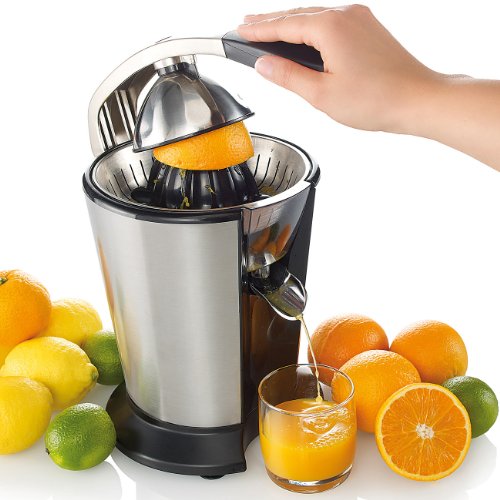 Hightech-Zitruspresse mit 120 Watt Leistung , teilweise aus Edelstahl • Kein Kleckern, Wischen und Tropfen: Verschließbarer Ausguss