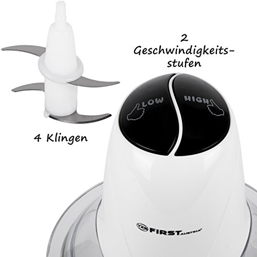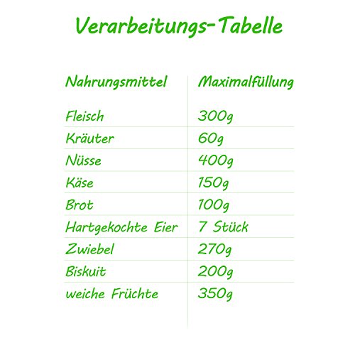 Die 4 Edelstahl Messer zerkleinern Fleisch, Nüsse und Kräuter Lebensmittelschonend und sind durch die höhen Anordnung noch effektiver. Der Glasbehälter und der Spritzschutz können in die Spülmaschine gegeben werden. Die Anti-Rutsch-Unterlage und der hochwertige massive Glas-Behälter ermöglichen einen sicheren Stand für die mit 350 Watt angetriebenen 4 Edelstahlmesser. Mit der 1,5 L großen Glasschüssel haben Sie ausreichend Platz für Ihre Lebensmittel.