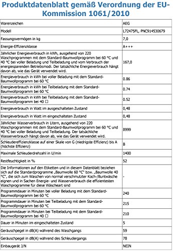 Lieferumfang: AEG L72475FL Waschmaschine Frontlader / A+++ / 1400 UpM / 7 kg / Weiß