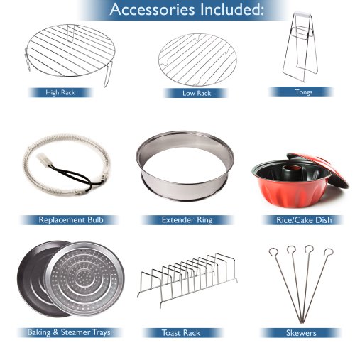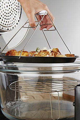 Zubehör: Zange, Hoch- und Flachrost, Backblech, Dampfblech, Erweiterungsring (bis zu 17L), Kuchen-/Reisform, Toastgrill, und Grillspieße.