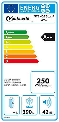 Bezeichnung: Bauknecht GTE 405 StopF A2+Energieeffizienzklasse Skala von A+++(niedriger Verbrauch) bis D(hoher Verbrauch): A++Energieverbrauch pro Jahr (kWh): 250Klimaklasse: SN-TTüranschlag: Left & RightLagerzeit bei Störung (h): 45Bruttogewicht (kg): 50Gefrierleistung (kg/24 Std.): 20Nettovolumen gesamt (Liter): 390Nettovolumen Kühlteil (Liter): Nettovolumen Gefrierteil (Liter): Maximale Geräuschentwicklung im Betrieb in Dezibel: 42Sterne-Kennzeichnung Gefrierteil: 4Gerätemaße (H x B x T) (mm): 916x1405x698