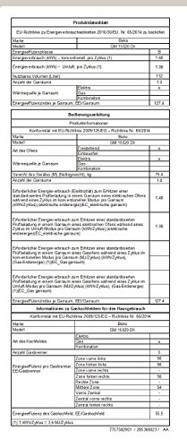 Ausstattung: Freistehend – 90 cm breit, Multifunktionsher, katalytische Seitenwände, Zeitschaltuhr, 104 l Innenraum, Kochfeld: 2 Normalbrenner mit 2 kW, 1 Sparbrenner mit 1 kW, 1 Starkbrenner 2,9 kW, 1 Wokbrenner 3,6 kW, Gassicherung, auf Erdgas voreingestellt, Propangas-Düsensatz, Backofen: Auftauen, Kleinflächengrill mit Umluft, Unterhitze mit Umluft, Ober- / Unterhitze, Umluft, Oberhitze mit Umluft, Grill, Backofenbeleuchtung, Temperaturwahlschalter, Zeitschaltuhr, 104 l Backofenvolumen, herausnehmbare Seitengitter, Aufbewahrungsfach mit Klappe, Stromverbrauch: konvent. Heizen 1,34 kWh, Heißluft 1,19 kWh, Maße H x B x T in cm: 85 x 90 x 60