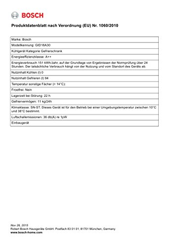 Bezeichnung: Bosch GID18A30Energieeffizienzklasse (Auf einer Skala von A+++ (höchste Effizienz) bis D (geringste Effizienz)): A++Energieverbrauch in kWh/Jahr, auf der Grundlage von Ergebnissen der Normprüfung über 24 Stunden. Der tatsächliche Verbrauch hängt von der Nutzung und vom Standort des Geräts ab.: 151Nutzinhalt Kühlfach in L: Nutzinhalt ****-Gefrierfach in L: 94Klimaklasse