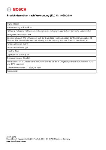 e. Kühlen / Gefrieren: Luftschallemissionen (dB): 37,00 dB(A) re 1 pW