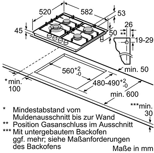 Bosch PCH615B90E Serie 6 Gas-Kochstelle / 58,2 cm / Edelstahl / Gusstopfträger / Thermoelektrische Zündsicherung / Anschlusskabel 1 m