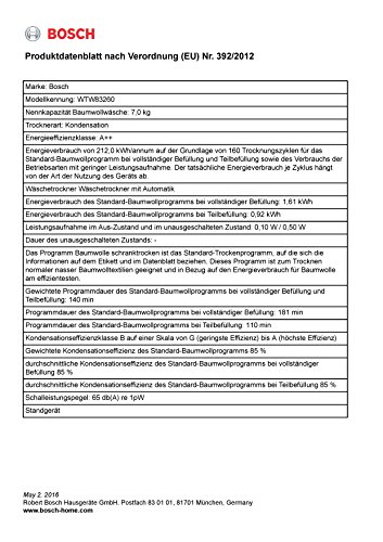 Bezeichnung: Bosch WTW83260Energieeffizienzklasse Skala von A(niedriger Verbrauch) bis G(hoher Verbrauch): A++Energieverbrauch kWh/Trocknungsprogramm: 181Geschätzter Jahresverbrauch Strom (kWh): 212Gerätetyp (Abluft oder Kondensation): KondensationGeräusch (db[A] 1 pW): 65Gewicht (kg): 49Füllmenge (Baumwolle) (kg): 7Gerätemaße (H x B x T) (mm): 842x598x652.