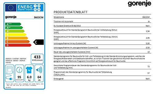 d. Trocknen: gewichteter jährl. Energieverbrauch (Aec): 433,00 kWh/Jahr Energieverbrauch in kWh/Jahr auf der Grundlage von 160 Standard-Trocknungszyklen für das Standard-Baumwollprogramm bei vollständiger Befüllung und Teilbefüllung sowie des Verbrauchs der Betriebsarten mit geringer Leistungsaufnahme. Der tatsächliche Energieverbrauch je Zyklus hängt von der Nutzung des Gerätes ab.