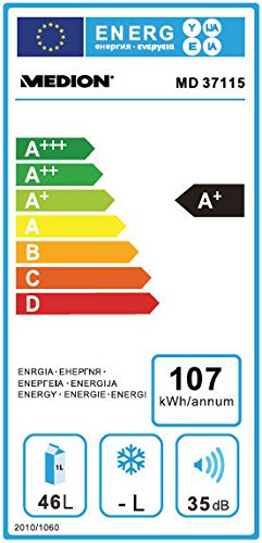 Der kleine freistehende Kühlschrank hat einen Geräuschpegel <35 dB und Energieeffizienzklasse: A+