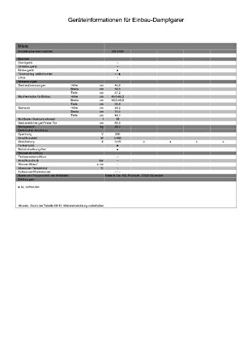 Miele DG 6100 Einbau-Dampfgarer Edelstahl BauformEinbau-Dampfgarer: Ja DesignContourLine: Ja Farbe: Edelstahl/Clean Steel Display: EasySensor GenussvorteileElektronische Temperaturregelung Dampfgarbetrieb 40 bis 100°C: JaExterne Dampferzeugung: Ja Menügaren ohneGeschmacksübertragung: Ja Automatikprogramme mit individuellerAnpassung des Garergebnisses: Ja BetriebsartenAutomatikprogramme: 20 Dampfgaren: Ja BedienkomfortDampfgaren auf bis zu 3 Ebenen gleichzeitig: Ja Dampfreduktion vorGarzeitende: Ja Ist-Temperaturanzeige: Ja Signalton bei Erreichen derSolltemperatur: Ja Individuelle Einstellungen: Ja GerätetürCleanGlass Tür: Ja Türanschlag: unten GarraumGarraumvolumen in l: 38 Edelstahl-Garraum: Ja Anzahl derEinschubebenen: 4 Belegfläche pro Einschubebene: 1/3 GN +1/2 GNHerausnehmbare Aufnahmegitter aus Edelstahl: Ja MultiSteam Modul: Ja PflegekomfortEdelstahl-Front mit CleanSteel-Oberfläche: Ja Externer Dampferzeuger:Ja Bodenheizkörper zur Kondensatreduktion: Ja AutomatischesEntkalken: Ja Dampftechnologie und WasserversorgungMultiSteam: Ja Wasservorrat für ca. 90 Minuten Garzeit: JaFrischwassertank: Ja SicherheitGerätekühlystem und kühle Front: Ja Sicherheitsausschaltung: JaWrasen-Kühlsystem: Ja Türkontaktschalter: Ja Technische DatenNischenmaße in mm (Breite): 560-568 Nischenmaße in mm (Höhe):448-452 Nischenmaße in mm (Tiefe): 550 Gesamtanschlusswert inkW: 3,6 Spannung in V: 230-240 Absicherung in A: 16 Phasenanzahl: 1 Mitgeliefertes…