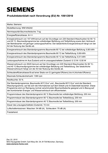 Bezeichnung: Siemens WM14N2A0Energieeffizienzklasse Skala von A+++(niedriger Verbrauch) bis D(hoher Verbrauch): A+++Schleuderwirkungsklasse (Skala von A(besser) bis G(schlechter): BMaximale Beladung in kg im Waschprogramm 40°/60°C Baumwolle: 7.0Schleuderdrehzahl in U/min: 1390Maximale Geräuschentwicklung beim Waschen in Dezibel: 54Maximale Geräuschentwicklung beim Schleudern in Dezibel: 75Energieverbrauch in kWh bei 220 Waschzyklen pro Jahr: 157Wasserverbrauch in Litern bei 220 Waschzyklen pro Jahr: 9020Abmessungen (HxBxT) in mm: 848x598x550. Der Wert hat mehr Zeichen als erlaubt: 20