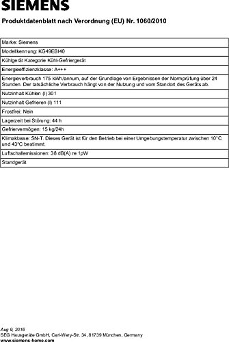 a. Kühlen / Gefrieren: Energieeffizienzklasse: A+++ auf einer Skala von A+++ (höchste Effizienz) bis D (geringste Effizienz)