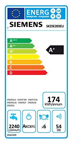 Hersteller und Modell: Siemens SK25E203EUEnergieeffizienzklasse (auf einer Skala von A+++ (höchste Effizienz) bis D (geringste Effizienz)): A+Nennkapazität in Standardgedecken: 6Energieverbrauch in kWh/Jahr auf der Grundlage von 280 Standardreinigungszyklen bei Kaltwasserbefüllung und dem Verbrauch der Betriebsarten mit geringer Leistungsaufnahme. Der tatsächliche Energieverbrauch hängt von der Art der Nutzung des Geräts ab.: 174Wasserverbrauch in Liter/Jahr, auf der Grundlage von 280 Standardreinigungszyklen. Der tatsächliche Wasserverbrauch hängt von der Art der Nutzung des Geräts ab.: 2240Trocknungseffizienzklasse (auf einer Skala von G (geringste Effizienz) bis A (höchste Effizienz)): ALuftschallemissionen in dB(A) re 1 pW: 54Einbaugerät: Wichtige Informationen