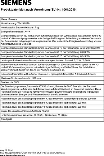 a. Waschen: Nennkapazität: 7,00 kg im Standardprogramm “Baumwolle 60°C”