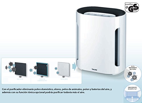 · Filtert die Luft mit einem Kombifilter (Aktivkohlefilter gegen schädliche Gase und unangenehme Gerüche, HEPA-Filter E 12 gegen Partikel wie Milben, Pollen,.. ); Mit zuschaltbarem Ionisator