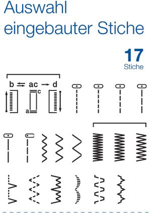 Das Wichtigste zusammengefasst: 17 Eingebaute Stiche, Einsetzen der Spulenkapsel von oben, LED-Beleuchtung, 4-Stufen-Knopflochautomatik, Klemmfreier Horizontalgreifer, Freiarm, Maximale Stichbreite 5 mm, Maximale Stichlänge 4 mm, Komfortables Einsetzen der Spule, Einfache Stichauswahl mit Wahlknopf