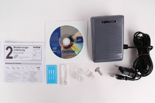 Serienzubehör: Zickzackfuß J (An der Maschine), Knopflochfuß A, Reißverschlussfuß I, Spulen (eine ist in der Maschine), Nadelsatz, Schraubendreher, Anleitung, Fußanlasser